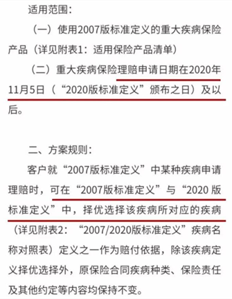 簡單來說就是舊規范下設計的重疾險,理賠的時候可以同時根據新舊規范的進行理賠,哪個能賠到,哪個理賠條件和理賠結果更優,就用哪個。只要你購買的是舊定義重疾,一旦出險且符合理賠條件,申請理賠的時候,可以自由選擇新、舊定義中更加寬松的理賠條件。